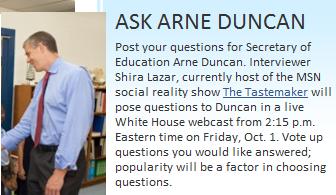 Visit this site to submit a question, and the question may be posed to the Secretary of Education on Friday, October 1 in a live White House webcast from 2:15 p.m. EST.