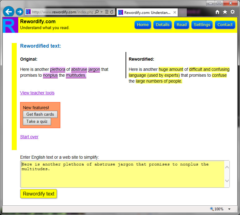 The site allows for a novel approach to comprehending difficult language, and it’s called their Rewordifying Engine. This software, that’s running behind their website, can detect in any text over 35,000 difficult words and phrases, determine how these challenging words and phrases are used in context, and replace them with easier-to-understand alternatives that preserve part of speech and verb tense.