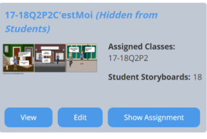 Here is one example from the “My Assignments†page on my account, showing what it looks like now for a former 6th grade Beginning French class. I can easily see the class and how many storyboards are there. I can click to see and edit my assignment and also view each of the storyboards created by the students.Â