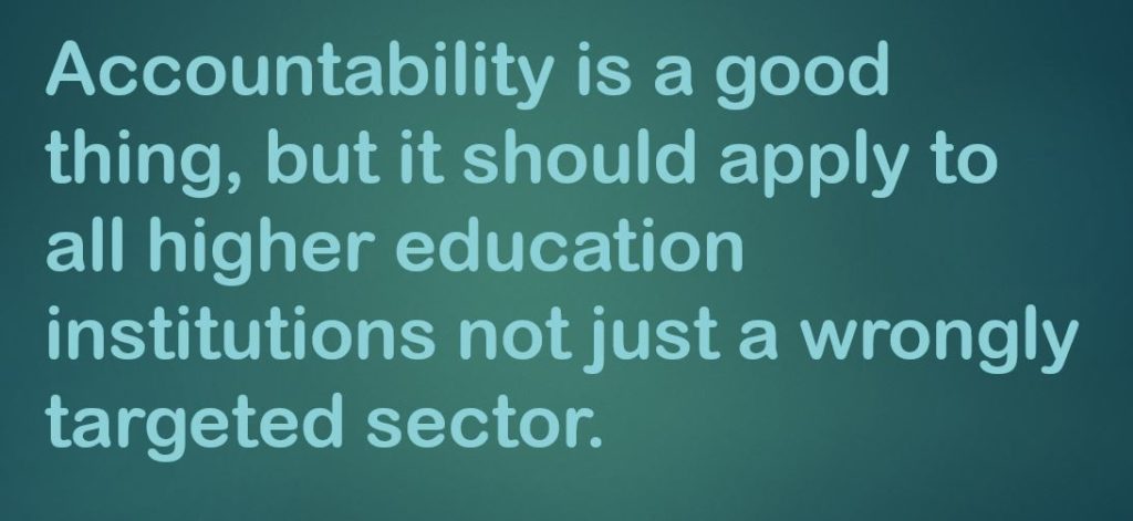 We’re just asking for a level playing field, where all colleges are evaluated (and regulated if necessary) based on quality student outcomes, not the tax status of the institution. It’s just about fundamental fairness.